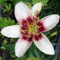 Лилия Уайт Пиксель из группы Азиатских гибридов сочетает в себе два, казалось бы, несовместимых окраса – нежный и экспрессивно-яркий. Ее необычные и невероятно крупные соцветия (до 20 см в диаметре!) выполнены в молочно-белом цвете, который интересно разбавлен интенсивным вишнево-бордовым крапом.
